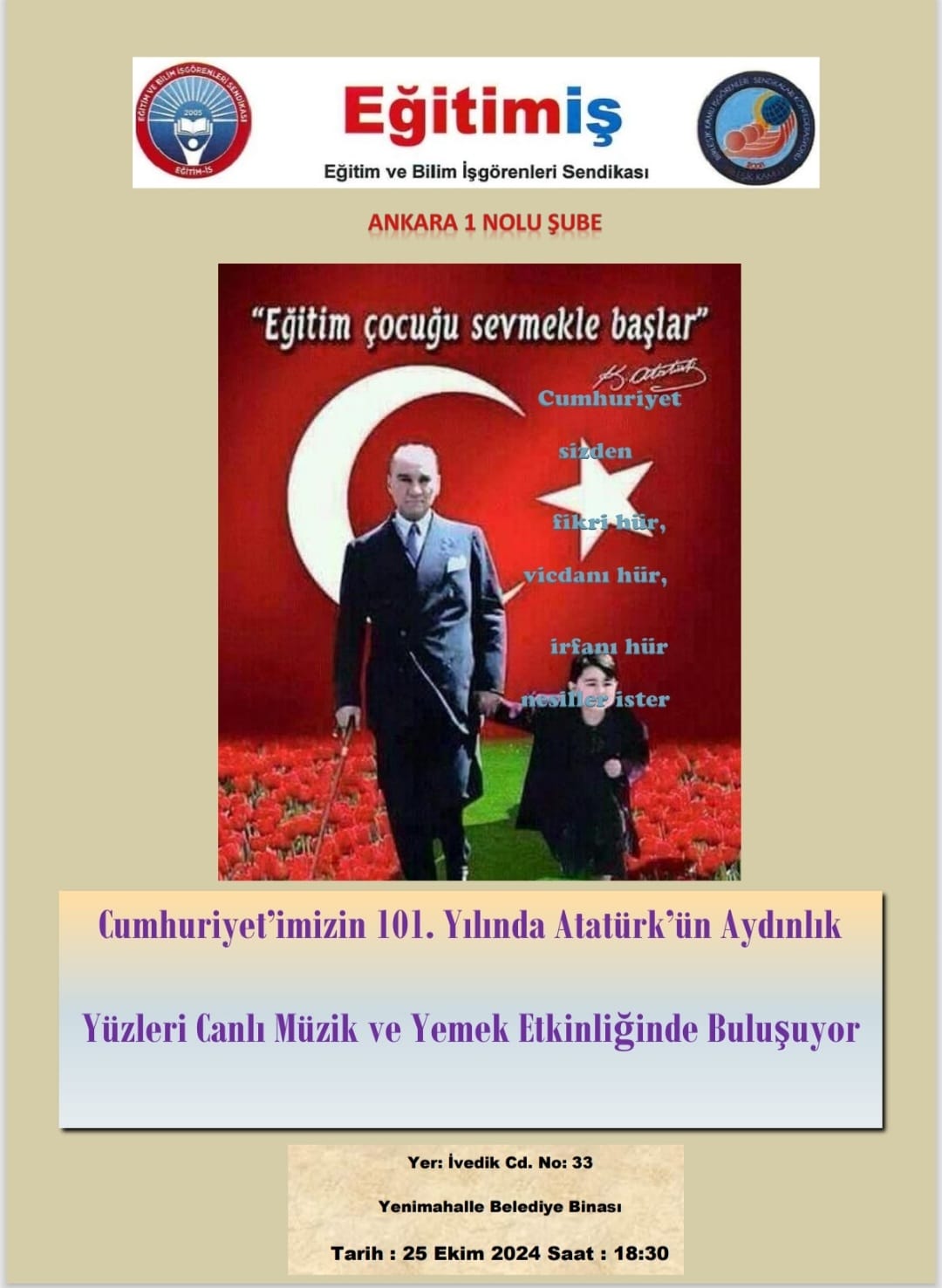 Şubemizin düzenlediği Cumhuriyetimizin 101.yılında Atatürk'ün Aydınlık Yüzleri Canlı Müzik ve Yemek Etkinliğimize davetlisiniz.