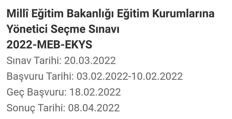 ÖSYM tarafından açıklanan takvime göre 2022 EKYS için başvurular 3-10 Şubat 2022 tarihleri arasında yapılacak. Sınav 20 Mart 2022 Pazar günü yapılacak. Sınav sonuçları ise 8 Nisan 2022 tarihinde açıklanacak.