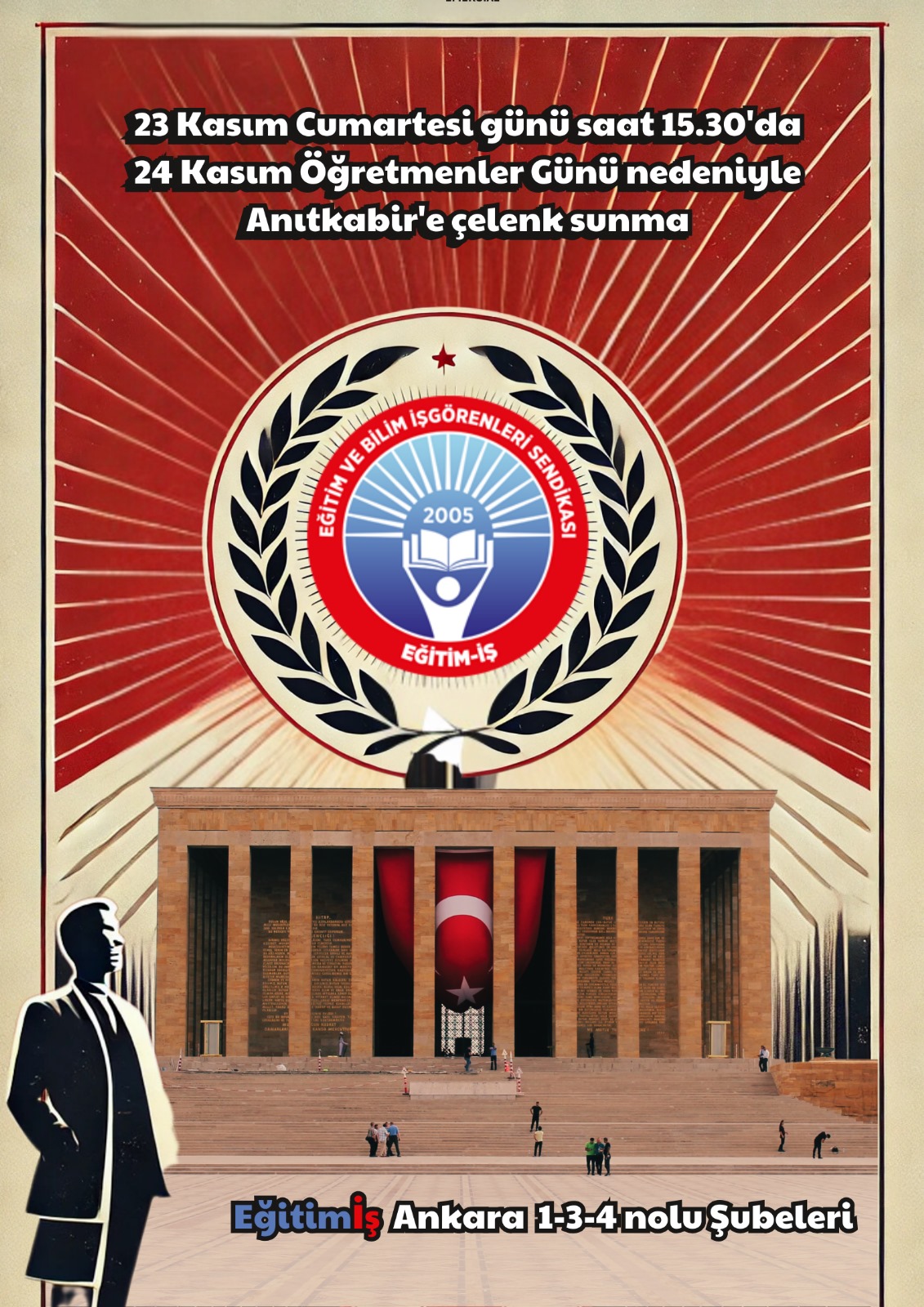 Sa, 11/19/2024 - 18:18 tarihinde egitimisankara tarafından gönderildi 23 Kasım 2024 Cumartesi Günü Saat 15:30'da Anıtkabir'de Atamızın manevi huzuruna çelenk koyacağız. Tüm üyelerimizi, emekçi eğitimcilerimizi ve halkımızı bekliyoruz.. Tarih Aralığı Ct, 11/23/2024 - 15:30 - Ct, 11/23/2024 - 16:30