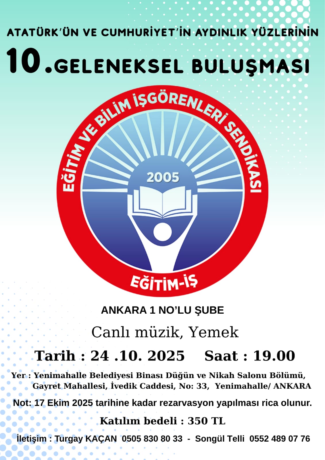 Eğitim İş 1 No'lu Şubemizin düzenlediği 10. Geleneksel Buluşması "Cumhuriyetimizin 102.yılında Atatürk'ün Aydınlık Yüzleri" Canlı Müzik ve Yemek Etkinliği'mize davetlisiniz.