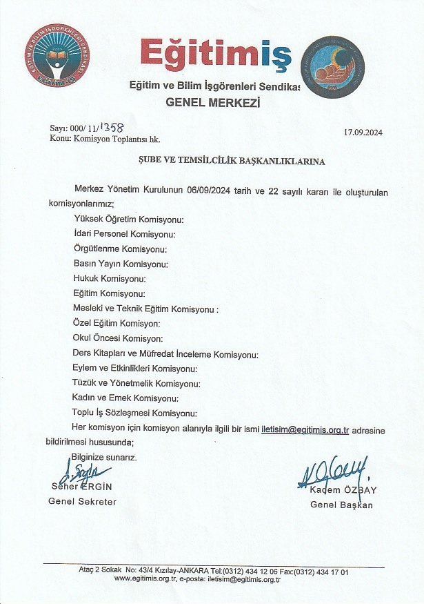 Merkez Yönetim Kurulumuzun 06.09.2024 tarih ve 22 sayılı kararı ile ile oluşturulan komisyonlarımız;