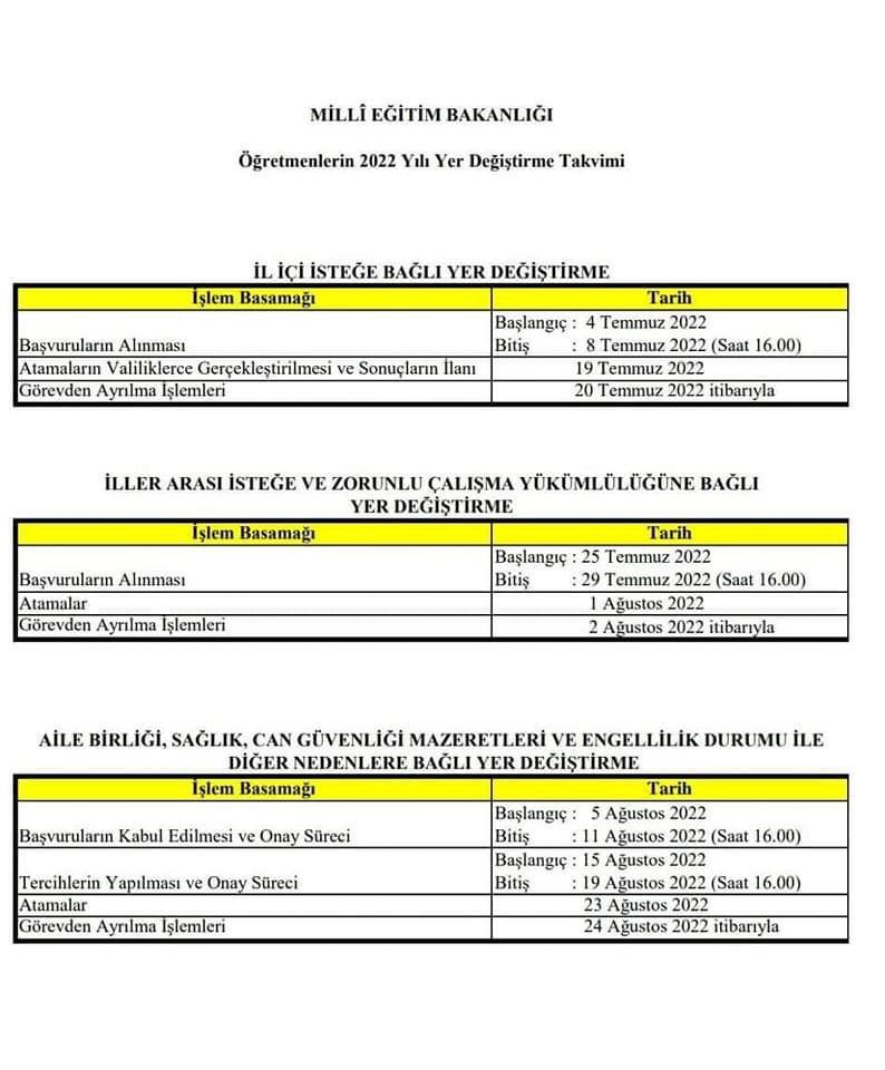 Buna göre il içi isteğe bağlı yer değiştirmeler için başvurular 4-8 Temmuz'da alınacak ve atamaların valiliklerce gerçekleştirilmesiyle sonuçların ilanı, 19 Temmuz'da olacak.