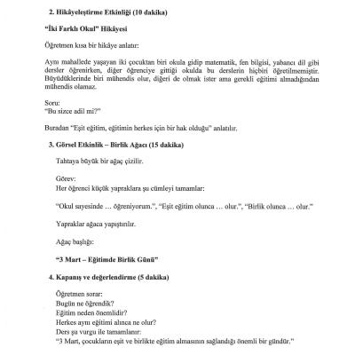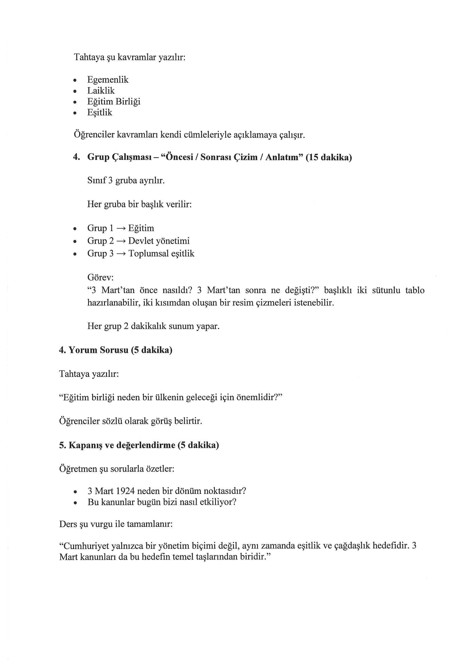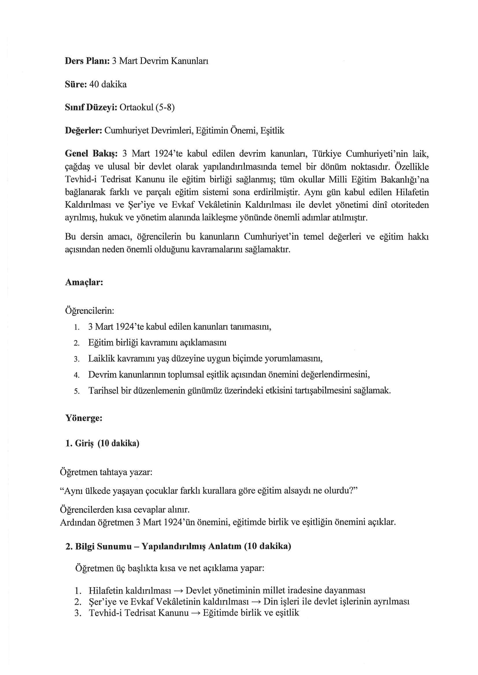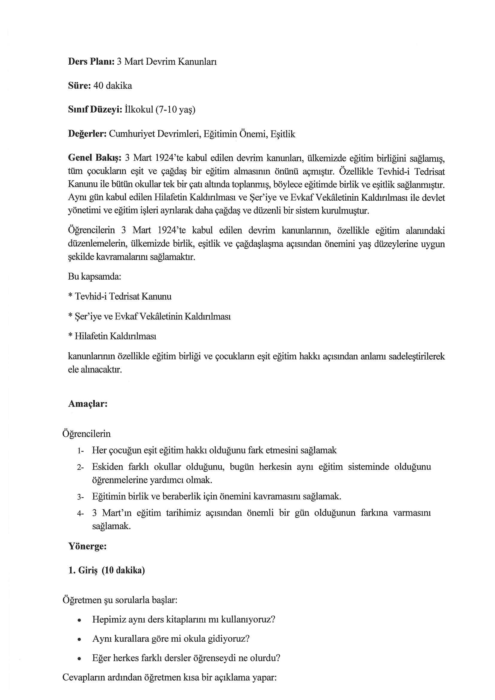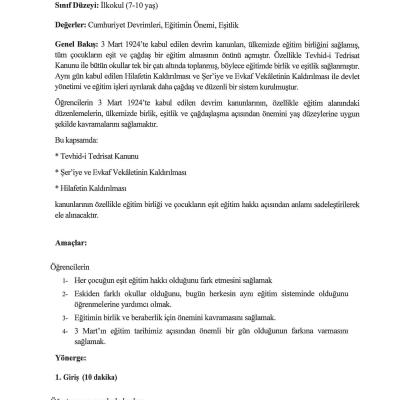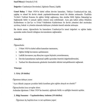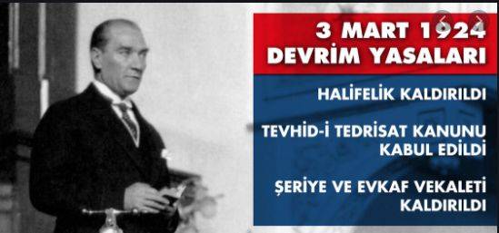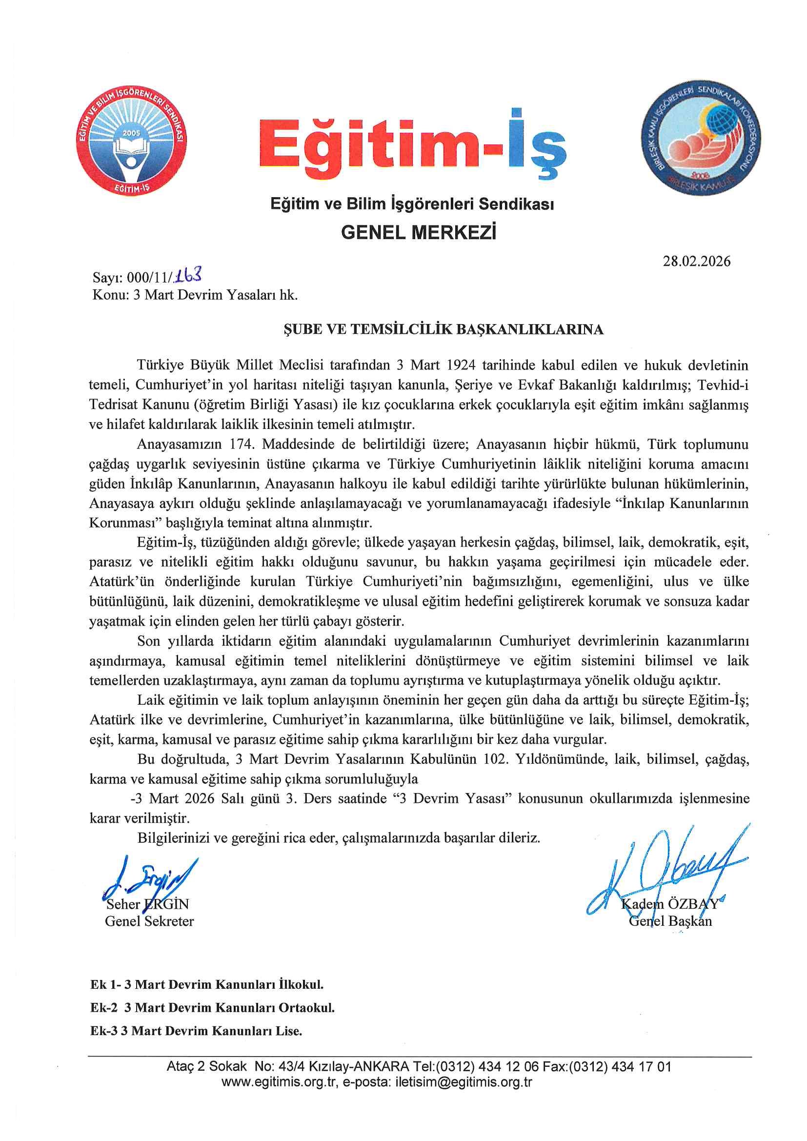 3 Mart Devrim Yasalarının kabulünün 102. yıldönümünde laik, bilimsel, çağdaş, karma ve kamusal eğitime sahip çıkma sorumluluğuyla 3 Mart 2026 Salı günü 3. ders saatinde "3 Mart Devrim Yasası" konusunun okullarımızda işlenmesine karar verilmiştir.