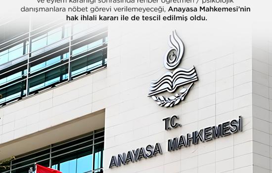 Eğitim İş’in 2017 yılından itibaren uzun soluklu sendikal mücadelesi ve eylem kararlığı sonrasında rehber öğretmen/psikolojik danışmanlara nöbet görevi verilemeyeceği, Anayasa Mahkemesi’nin hak ihlali kararı ile de tescil edilmiş oldu.
