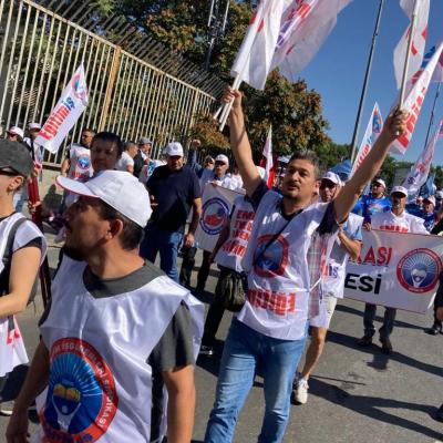 Türkiye’nin çeşitli illerinden gelen yaklaşık on bin Eğitim-İş üyesi, Ulus’ta ilk Meclis binası önünde bir araya geldi.