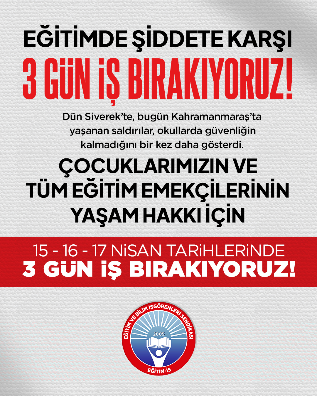 Bu nedenle; yaşanan saldırılar karşısında sessiz kalmıyor, geri adım atmıyoruz. Çocuklarımızın yaşam hakkı, eğitim emekçilerinin can güvenliği için, 15, 16, 17 Nisan tarihlerinde İŞ BIRAKIYORUZ.