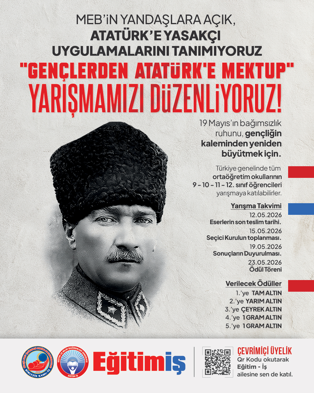 Eğitim-İş olarak, Cumhuriyetimizin kurucusu Büyük Önder Mustafa Kemal Atatürk’ü anmak, ilke ve devrimlerini gelecek nesillere aktarmak amacıyla yıllardır 19 Mayıs Atatürk’ü Anma, Gençlik ve Spor Bayramı kapsamında düzenleyerek geleneksel hala getirdiğimiz "Gençlerden Atatürk’e Mektup" yarışmamız için gerekli belgeleri 18 Şubat 2026’da Milli Eğitim Bakanlığı’na ilettik.