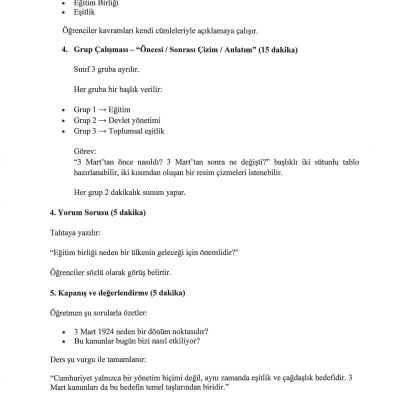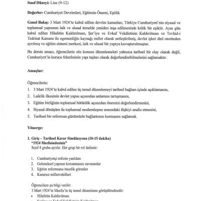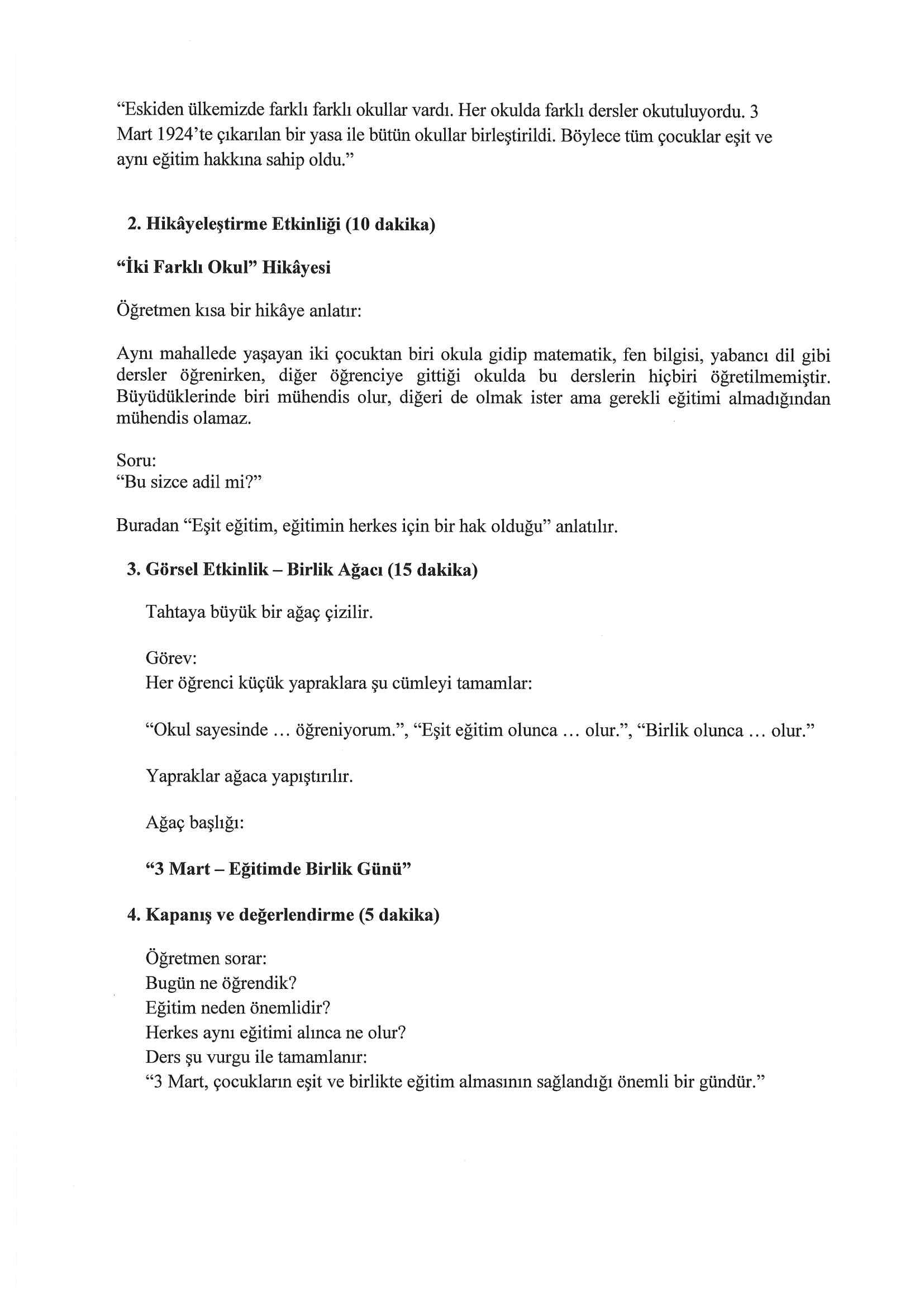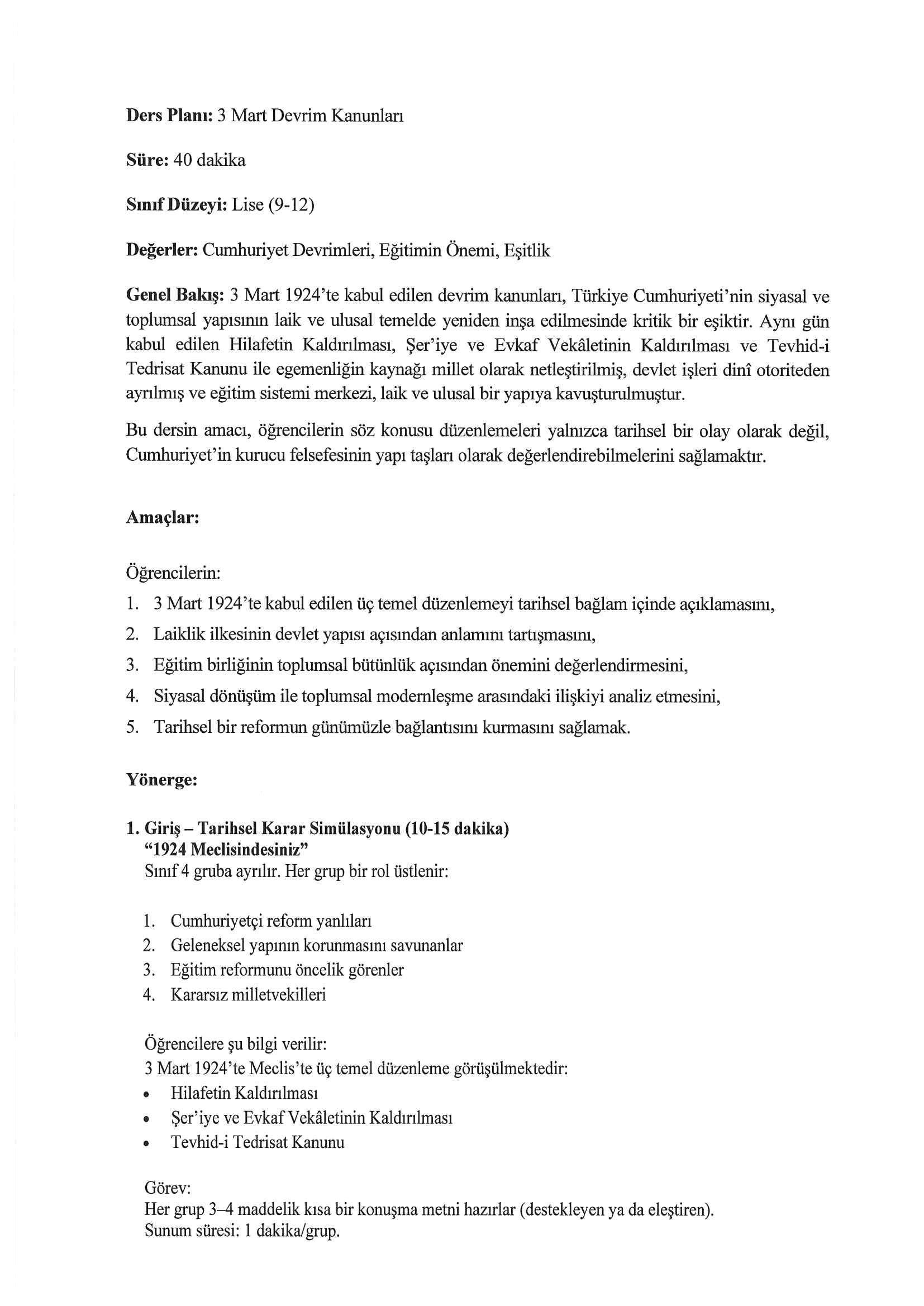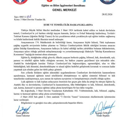 3 Mart Devrim Yasalarının kabulünün 102. yıldönümünde laik, bilimsel, çağdaş, karma ve kamusal eğitime sahip çıkma sorumluluğuyla 3 Mart 2026 Salı günü 3. ders saatinde "3 Mart Devrim Yasası" konusunun okullarımızda işlenmesine karar verilmiştir.